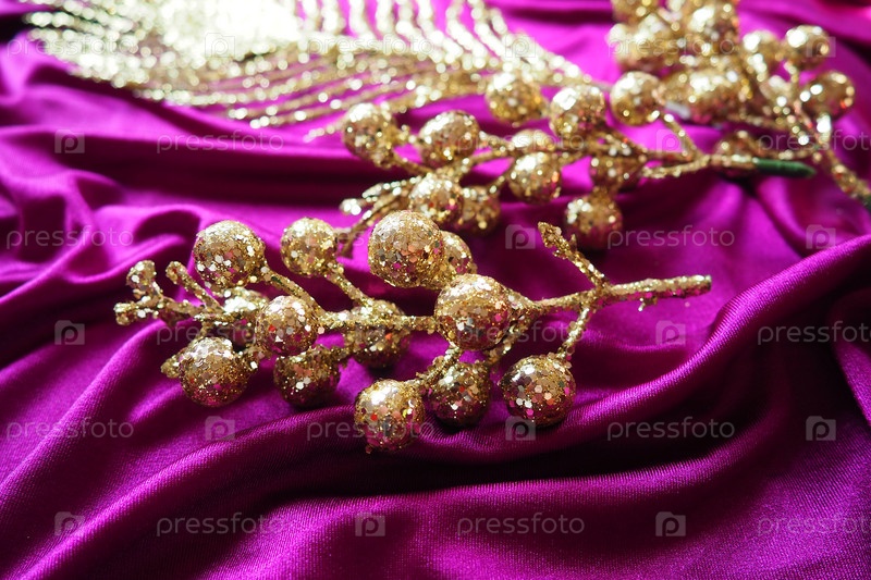 Фиолетовый розовый сиреневый фиолетовый фон текстуры шелковой ткани. Красивые складки на скрученном материале. Золотые новогодние рождественские украшения, перо Жар-птицы, ягоды и веточки. Копирование пространства. Рождественский дизайн