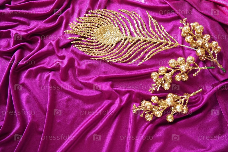 Фиолетовый розовый сиреневый фиолетовый фон текстуры шелковой ткани. Красивые складки на скрученном материале. Золотые новогодние рождественские украшения, перо Жар-птицы, ягоды и веточки. Копирование пространства. Рождественский дизайн