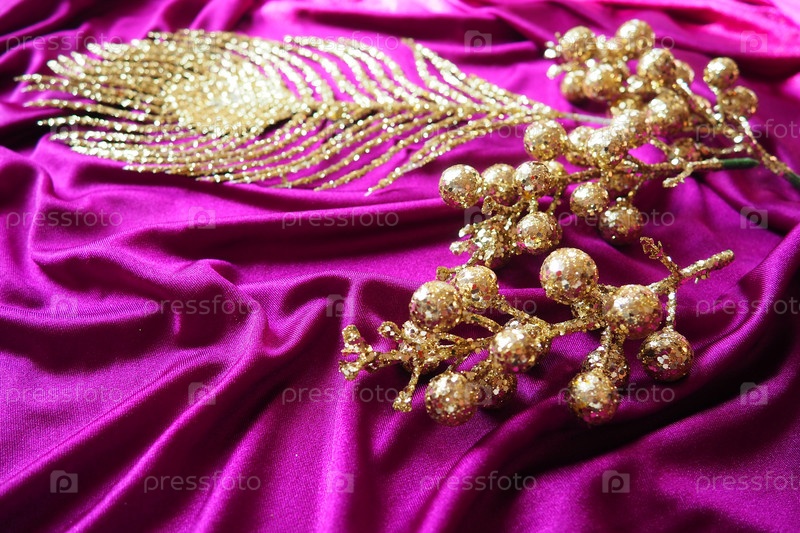 Фиолетовый розовый сиреневый фиолетовый фон текстуры шелковой ткани. Красивые складки на скрученном материале. Золотые новогодние рождественские украшения, перо Жар-птицы, ягоды и веточки. Копирование пространства. Рождественский дизайн