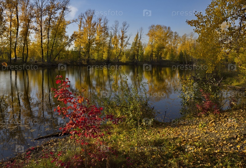 Россия. Юг Западной Сибири, Кузбасс. Безветренный солнечный вечер на Притомских карьерах Новокузнецка в середине осени