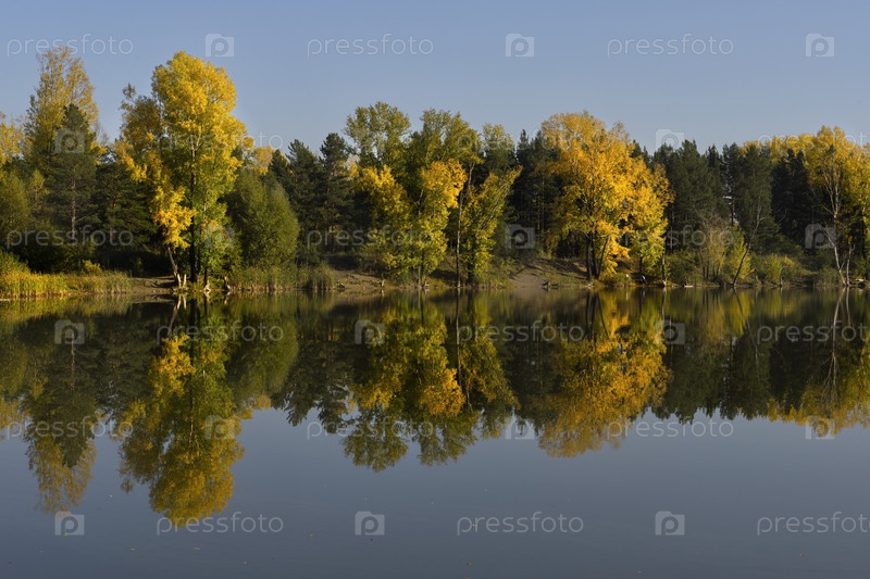 Россия. Юг Западной Сибири, Кузбасс. Безветренный солнечный вечер на Притомских карьерах Новокузнецка в середине осени
