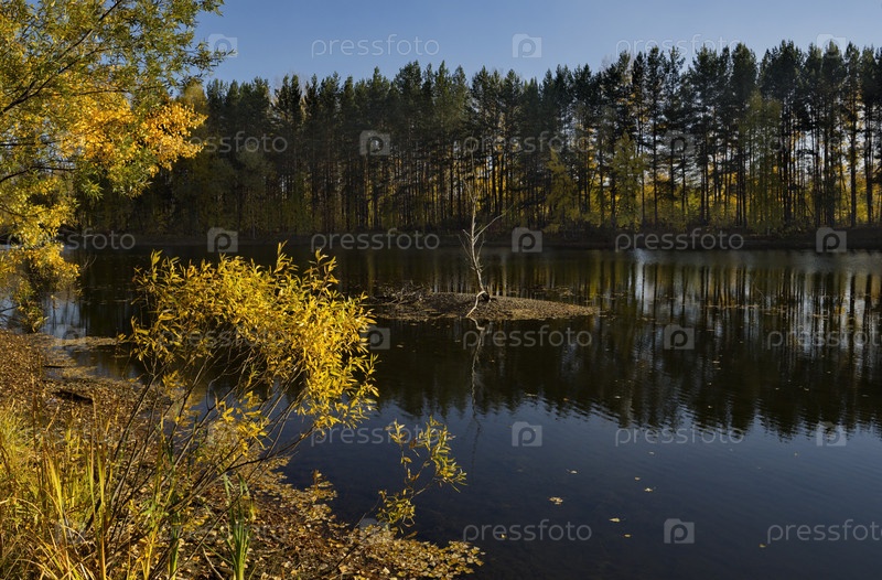 Россия. Юг Западной Сибири, Кузбасс. Безветренный солнечный вечер на Притомских карьерах Новокузнецка в середине осени
