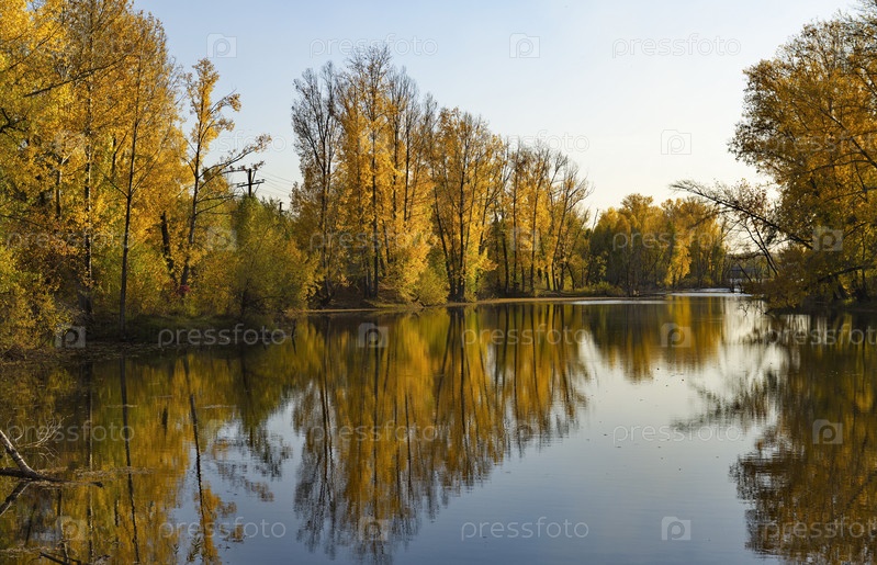 Россия. Юг Западной Сибири, Кузбасс. Безветренный солнечный вечер на Притомских карьерах Новокузнецка в середине осени