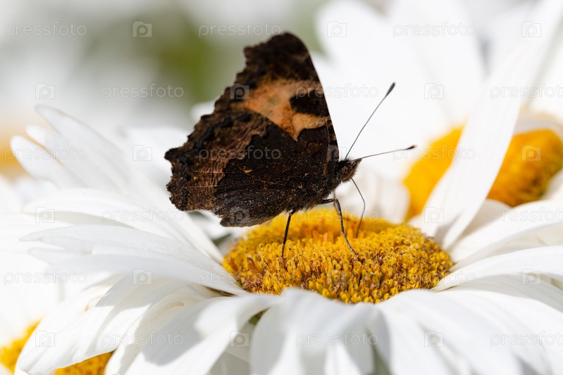 Бабочка сидит на белой ромашке