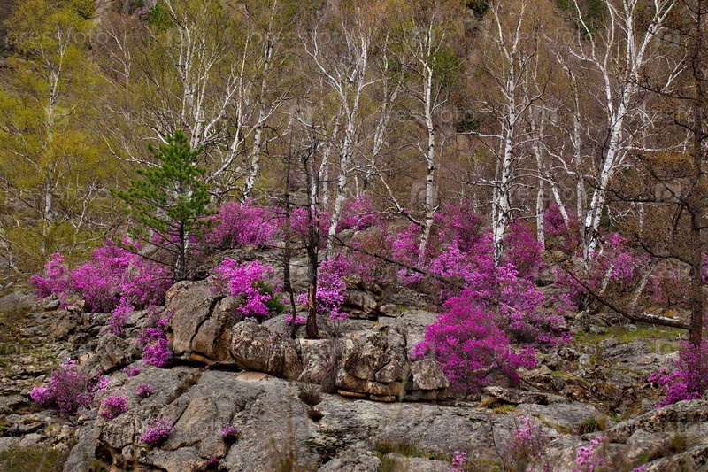 Россия. Юг Западной Сибири, весенние цветы Горного Алтая. Рододендрон. Период его цветения - главное событие весны в Горном Алтае, которое привлекает множество туристов