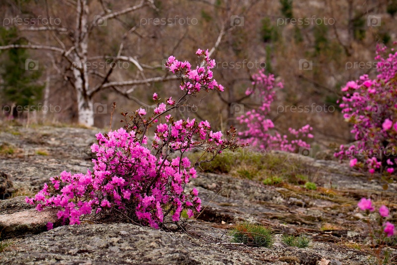Россия. Юг Западной Сибири, весенние цветы Горного Алтая. Рододендрон. Период его цветения - главное событие весны в Горном Алтае, которое привлекает множество туристов