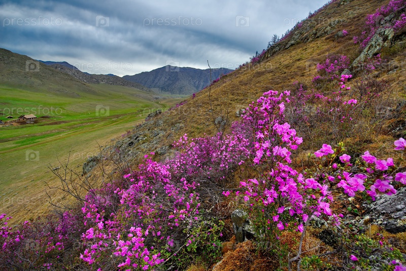 Россия. Юг Западной Сибири, весенние цветы Горного Алтая. Рододендрон. Период его цветения - главное событие весны в Горном Алтае, которое привлекает множество туристов