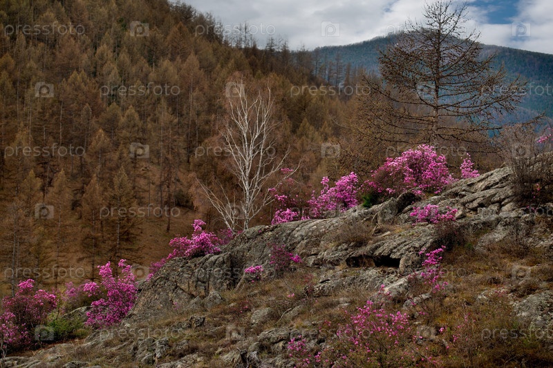 Россия. Юг Западной Сибири, весенние цветы Горного Алтая. Рододендрон. Период его цветения - главное событие весны в Горном Алтае, которое привлекает множество туристов