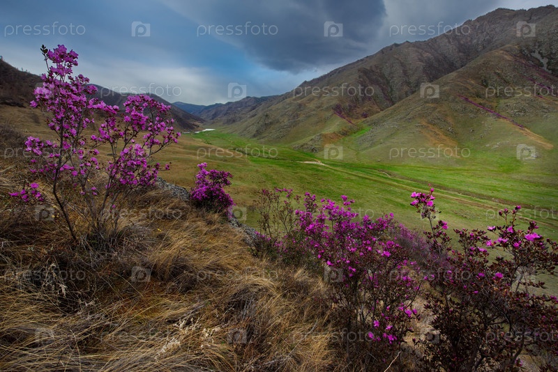 Россия. Юг Западной Сибири, весенние цветы Горного Алтая. Рододендрон. Период его цветения - главное событие весны в Горном Алтае, которое привлекает множество туристов