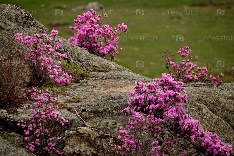 Россия. Юг Западной Сибири, весенние цветы Горного Алтая. Рододендрон. Период его цветения - главное событие весны в Горном Алтае, которое привлекает множество туристов