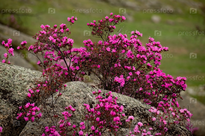 Россия. Юг Западной Сибири, весенние цветы Горного Алтая. Рододендрон. Период его цветения - главное событие весны в Горном Алтае, которое привлекает множество туристов