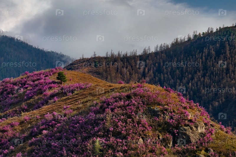 Россия. Юг Западной Сибири, весенние цветы Горного Алтая. Рододендрон. Период его цветения - главное событие весны в Горном Алтае, которое привлекает множество туристов