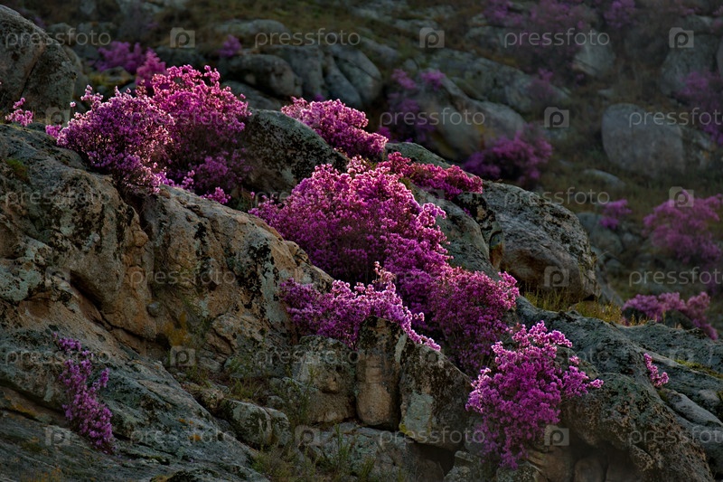 Россия. Юг Западной Сибири, весенние цветы Горного Алтая. Рододендрон. Период его цветения - главное событие весны в Горном Алтае, которое привлекает множество туристов