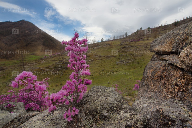 Россия. Юг Западной Сибири, весенние цветы Горного Алтая. Рододендрон. Период его цветения - главное событие весны в Горном Алтае, которое привлекает множество туристов