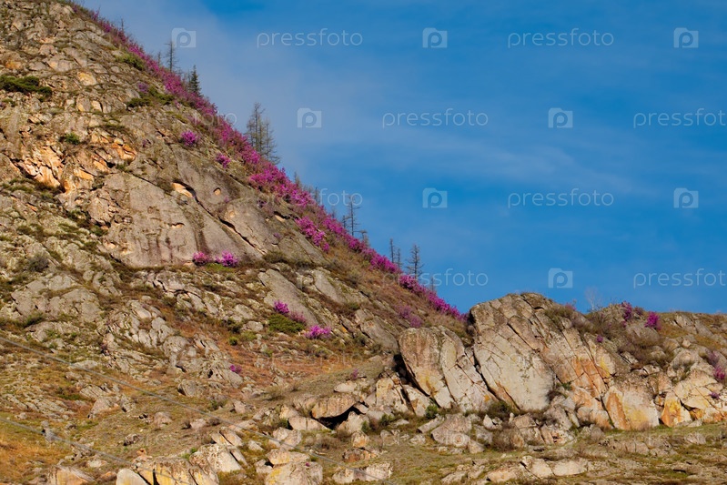 Россия. Юг Западной Сибири, весенние цветы Горного Алтая. Рододендрон. Период его цветения - главное событие весны в Горном Алтае, которое привлекает множество туристов