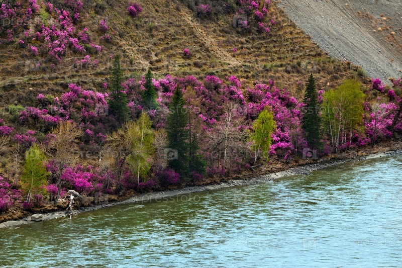 Россия. Юг Западной Сибири, весенние цветы Горного Алтая. Рододендрон. Период его цветения - главное событие весны в Горном Алтае, которое привлекает множество туристов