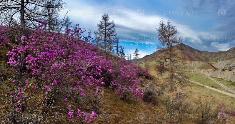 Россия. Юг Западной Сибири, весенние цветы Горного Алтая. Рододендрон. Период его цветения - главное событие весны в Горном Алтае, которое привлекает множество туристов