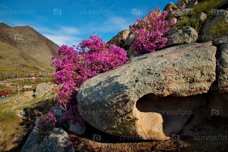 Россия. Юг Западной Сибири, весенние цветы Горного Алтая. Рододендрон. Период его цветения - главное событие весны в Горном Алтае, которое привлекает множество туристов