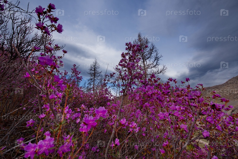 Россия. Юг Западной Сибири, весенние цветы Горного Алтая. Рододендрон. Период его цветения - главное событие весны в Горном Алтае, которое привлекает множество туристов