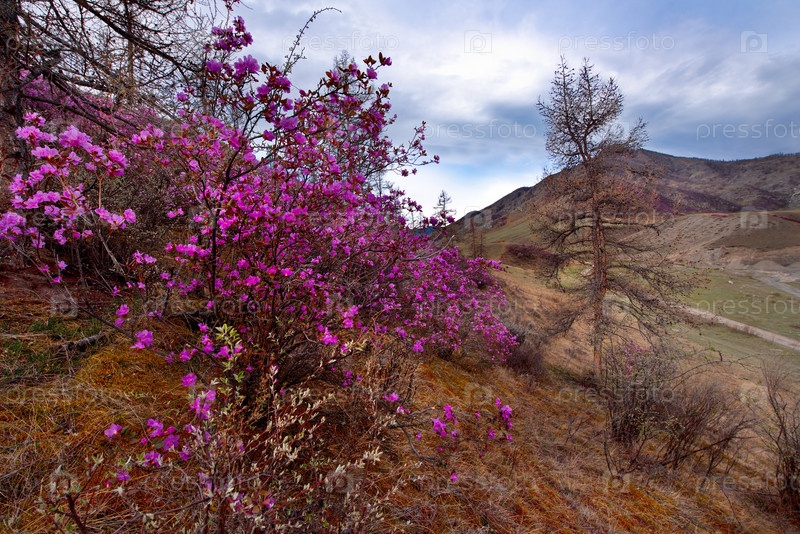 Россия. Юг Западной Сибири, весенние цветы Горного Алтая. Рододендрон. Период его цветения - главное событие весны в Горном Алтае, которое привлекает множество туристов