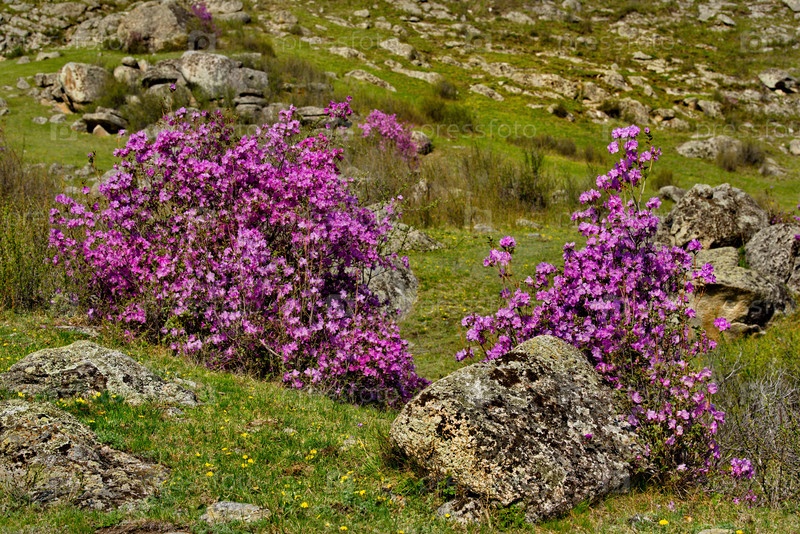 Россия. Юг Западной Сибири, весенние цветы Горного Алтая. Рододендрон. Период его цветения - главное событие весны в Горном Алтае, которое привлекает множество туристов