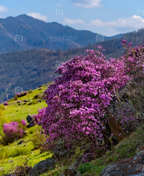 Россия. Юг Западной Сибири, весенние цветы Горного Алтая. Рододендрон. Период его цветения - главное событие весны в Горном Алтае, которое привлекает множество туристов