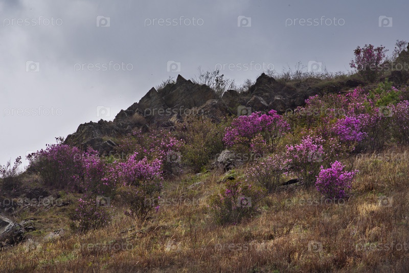 Россия. Юг Западной Сибири, весенние цветы Горного Алтая. Рододендрон. Период его цветения - главное событие весны в Горном Алтае, которое привлекает множество туристов
