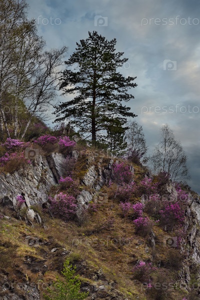 Россия. Юг Западной Сибири, весенние цветы Горного Алтая. Рододендрон. Период его цветения - главное событие весны в Горном Алтае, которое привлекает множество туристов