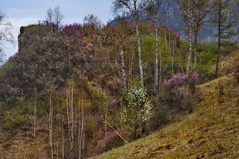 Россия. Юг Западной Сибири, весенние цветы Горного Алтая. Рододендрон. Период его цветения - главное событие весны в Горном Алтае, которое привлекает множество туристов