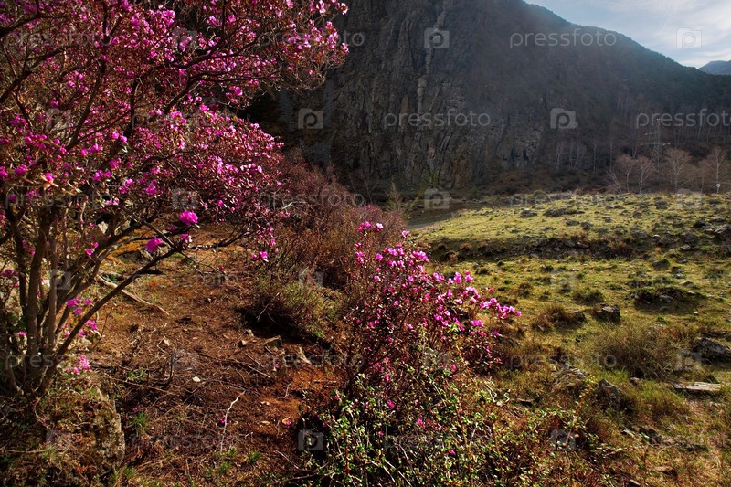 Россия. Юг Западной Сибири, весенние цветы Горного Алтая. Рододендрон. Период его цветения - главное событие весны в Горном Алтае, которое привлекает множество туристов
