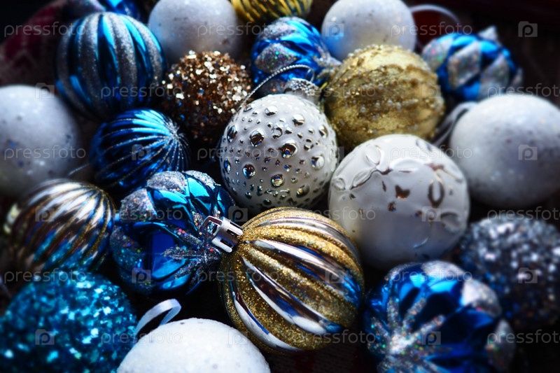 Новогодние елочные шары и украшения крупным планом. Много украшений золотого, синего, желтого, белого, серебряного цвета. Полосатые елочные шары лежат на поверхности. Праздничный красивый красочный фон. Дизайн