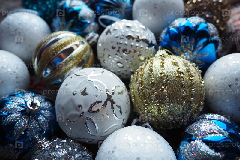 Новогодние елочные шары и украшения крупным планом. Много украшений золотого, синего, желтого, белого, серебряного цвета. Полосатые елочные шары лежат на поверхности. Праздничный красивый красочный фон. Дизайн