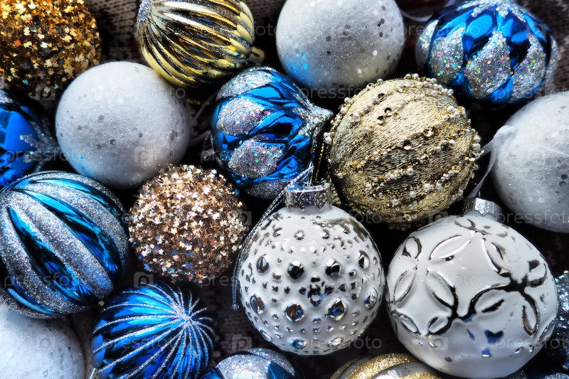 Новогодние елочные шары и украшения крупным планом. Много украшений золотого, синего, желтого, белого, серебряного цвета. Полосатые елочные шары лежат на поверхности. Праздничный красивый красочный фон. Дизайн