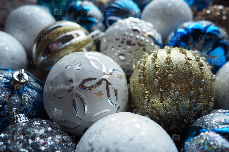 Новогодние елочные шары и украшения крупным планом. Много украшений золотого, синего, желтого, белого, серебряного цвета. Полосатые елочные шары лежат на поверхности. Праздничный красивый красочный фон. Дизайн