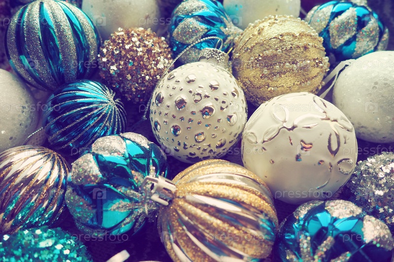 Новогодние елочные шары и украшения крупным планом. Много украшений золотого, синего, желтого, белого, серебряного цвета. Полосатые елочные шары лежат на поверхности. Праздничный красивый красочный фон. Дизайн