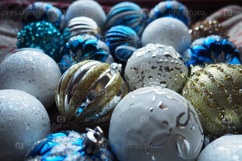 Новогодние елочные шары и украшения крупным планом. Много украшений золотого, синего, желтого, белого, серебряного цвета. Полосатые елочные шары лежат на поверхности. Праздничный красивый красочный фон. Дизайн