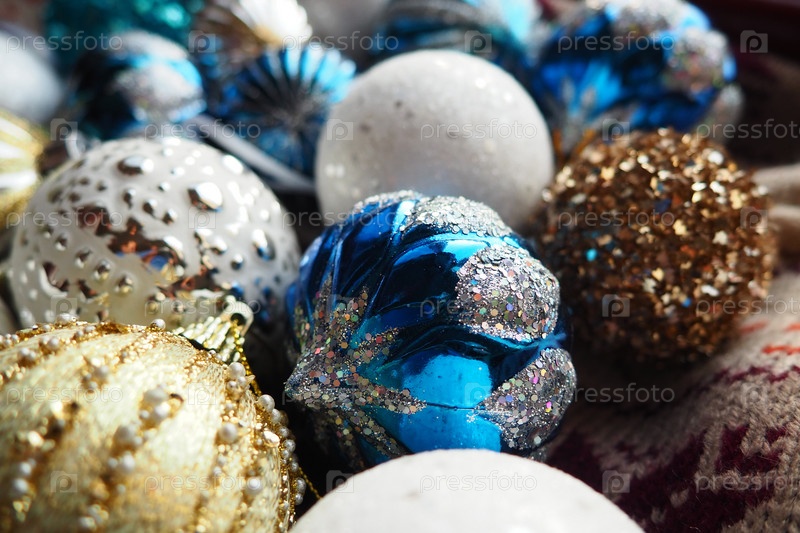 Новогодние елочные шары и украшения крупным планом. Много украшений золотого, синего, желтого, белого, серебряного цвета. Полосатые елочные шары лежат на поверхности. Праздничный красивый красочный фон. Дизайн