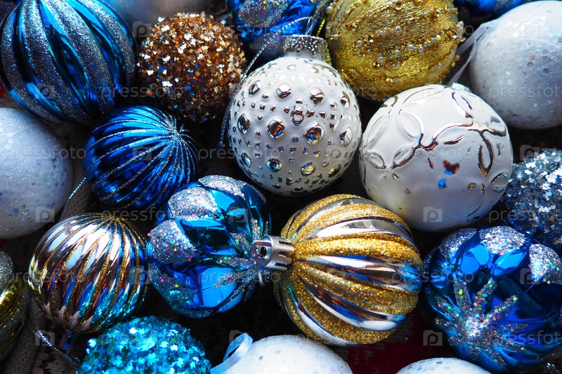 Новогодние елочные шары и украшения крупным планом. Много украшений золотого, синего, желтого, белого, серебряного цвета. Полосатые елочные шары лежат на поверхности. Праздничный красивый красочный фон. Дизайн
