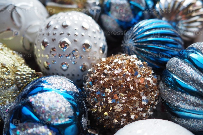 Новогодние елочные шары и украшения крупным планом. Много украшений золотого, синего, желтого, белого, серебряного цвета. Полосатые елочные шары лежат на поверхности. Праздничный красивый красочный фон. Дизайн