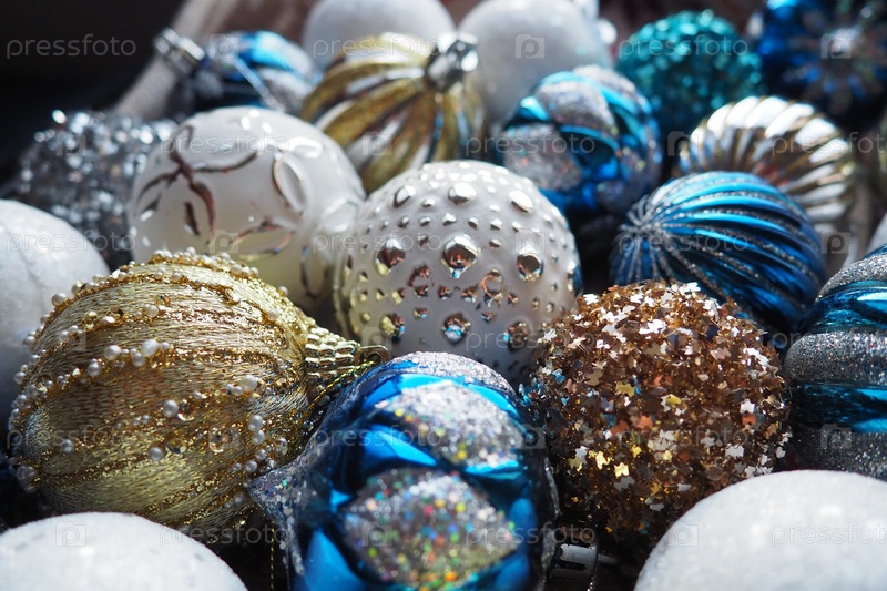 Новогодние елочные шары и украшения крупным планом. Много украшений золотого, синего, желтого, белого, серебряного цвета. Полосатые елочные шары лежат на поверхности. Праздничный красивый красочный фон. Дизайн