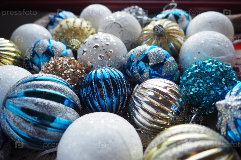 Новогодние елочные шары и украшения крупным планом. Много украшений золотого, синего, желтого, белого, серебряного цвета. Полосатые елочные шары лежат на поверхности. Праздничный красивый красочный фон. Дизайн