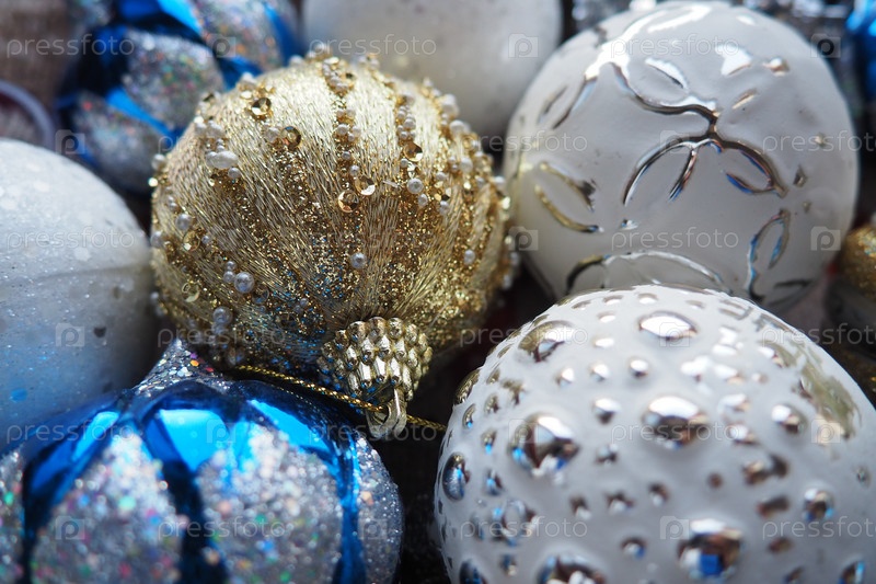Новогодние елочные шары и украшения крупным планом. Много украшений золотого, синего, желтого, белого, серебряного цвета. Полосатые елочные шары лежат на поверхности. Праздничный красивый красочный фон. Дизайн