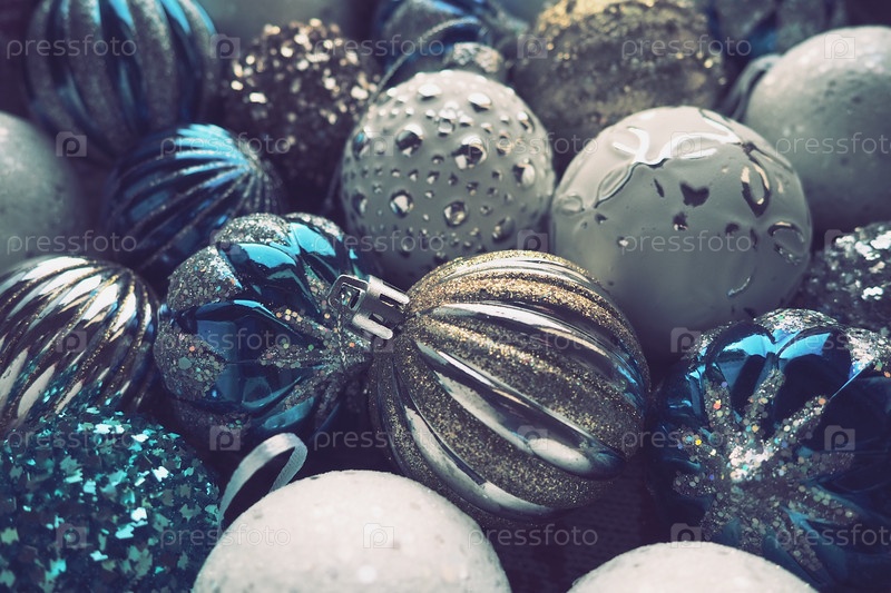 Новогодние елочные шары и украшения крупным планом. Много украшений золотого, синего, желтого, белого, серебряного цвета. Полосатые елочные шары лежат на поверхности. Праздничный красивый красочный фон. Дизайн