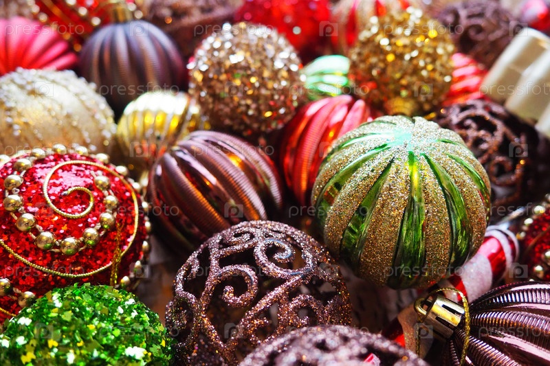 Новогодние елочные шары и украшения крупным планом. Много декора золотого, красного, желтого, коричневого, зеленого, серебряного цвета. Полосатые елочные шары лежат кучей. Праздничный красивый красочный фон. Дизайн