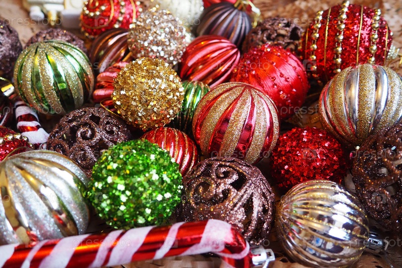 Новогодние елочные шары и украшения крупным планом. Много декора золотого, красного, желтого, коричневого, зеленого, серебряного цвета. Полосатые елочные шары лежат кучей. Праздничный красивый красочный фон. Дизайн