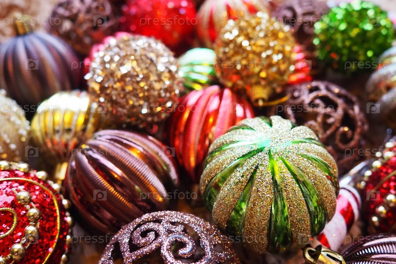 Новогодние елочные шары и украшения крупным планом. Много декора золотого, красного, желтого, коричневого, зеленого, серебряного цвета. Полосатые елочные шары лежат кучей. Праздничный красивый красочный фон. Дизайн