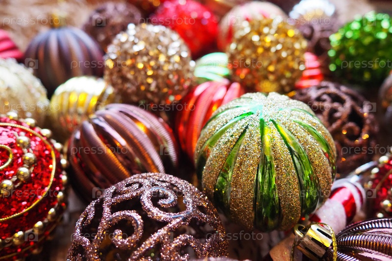 Новогодние елочные шары и украшения крупным планом. Много декора золотого, красного, желтого, коричневого, зеленого, серебряного цвета. Полосатые елочные шары лежат кучей. Праздничный красивый красочный фон. Дизайн
