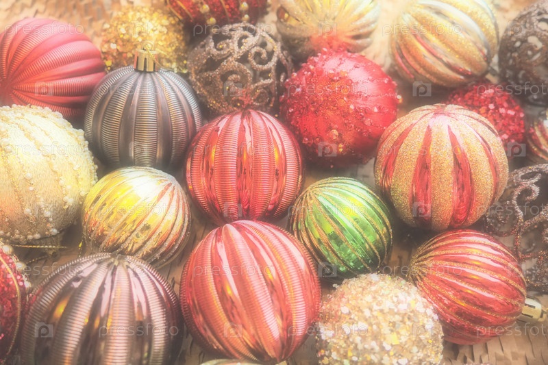 Новогодние елочные шары и украшения крупным планом. Много декора золотого, красного, желтого, коричневого, зеленого, серебряного цвета. Полосатые елочные шары лежат кучей. Праздничный красивый красочный фон. Дизайн