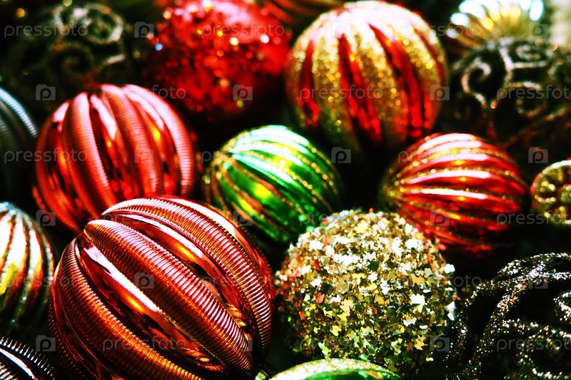 Новогодние елочные шары и украшения крупным планом. Много декора золотого, красного, желтого, коричневого, зеленого, серебряного цвета. Полосатые елочные шары лежат кучей. Праздничный красивый красочный фон. Дизайн