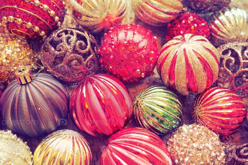 Новогодние елочные шары и украшения крупным планом. Много декора золотого, красного, желтого, коричневого, зеленого, серебряного цвета. Полосатые елочные шары лежат кучей. Праздничный красивый красочный фон. Дизайн